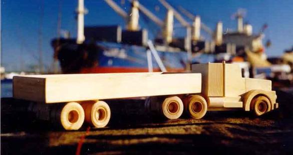 | Load up your favorite toys on this one and drive it to the job site. This heavy mover will move items too big for the Eighteen Wheeler or the Logging Truck. The Flatbed Truck features include: a solid wood tractor complete with sleeper cab, maple wheels, and a detachable gravel trailer. The Flatbed Truck measures 25"L x 5"W x 5-1/2"H. |