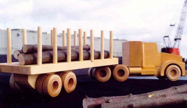 | Just like the ones you see on Northern Maine roads. Used to haul all types of cargo, from lumber and pipe to Christmas Trees. Logging Trucks handle it all. Features include: solid wood construction, maple wheels, and a detachable log trailer. The Logging Truck measures 25"L x 5"W x 6-1/2"H. |
